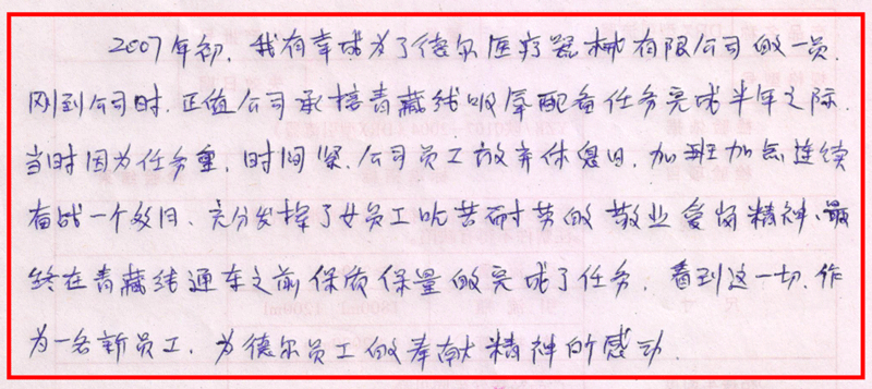 歸屬感。張總經(jīng)理對大家很照顧。剛從江蘇回來很不適應(yīng)寶雞,但是來到德爾醫(yī)械這么多年,張總經(jīng)理多年以來對其培養(yǎng)、教育、看重分不開。雖然,成長的有一些慢,但是收獲很多。